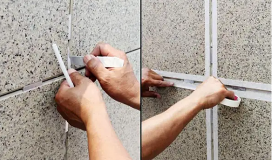 用膠槍裝上耐候膠(硅酮膠)進行密封、勾縫處理,修刮平整后撕下美紋紙。