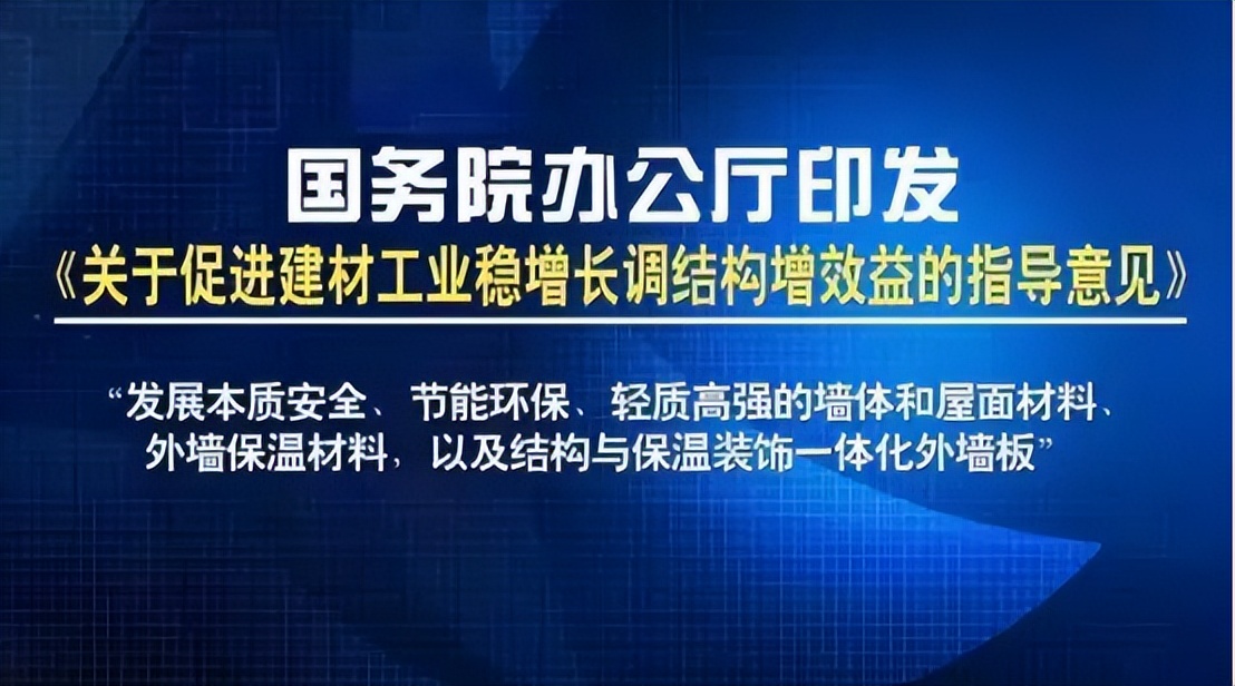 國務(wù)院辦公廳印發(fā)《關(guān)于促進(jìn)建材工業(yè)穩(wěn)增長調(diào)結(jié)構(gòu)增效益的指導(dǎo)意見》中,明確指出“發(fā)展本質(zhì)安全、節(jié)能環(huán)保、輕質(zhì)高強的墻體和屋面材料、 外墻保溫材料,以及結(jié)構(gòu)與保溫裝飾一體化外墻板”。