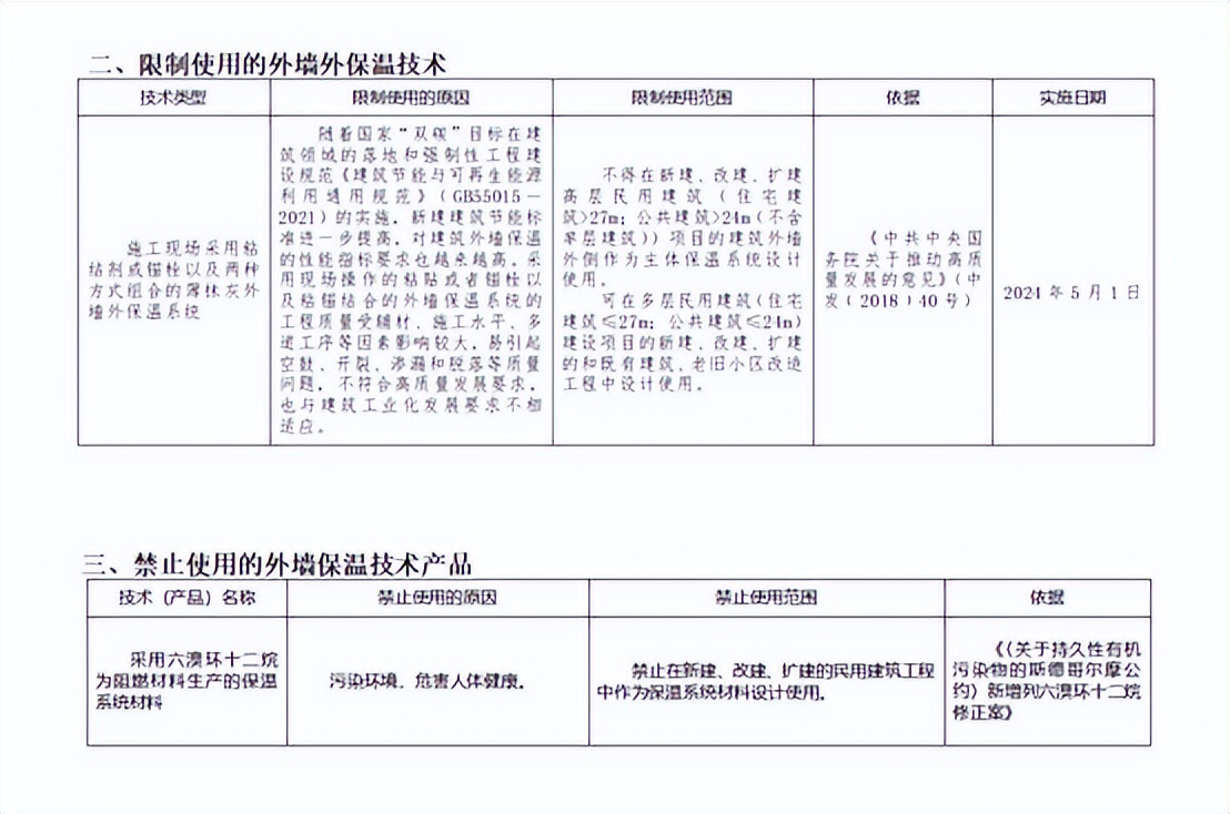 2024年5月1日起,禁止在新建、改建、擴建高層民用建筑(住宅建筑>27m;公共建筑>24m(不含單層建筑))項目中使用限制類外墻外保溫技術(shù)。嚴禁在外墻外保溫系統(tǒng)中使用禁止類技術(shù)產(chǎn)品。