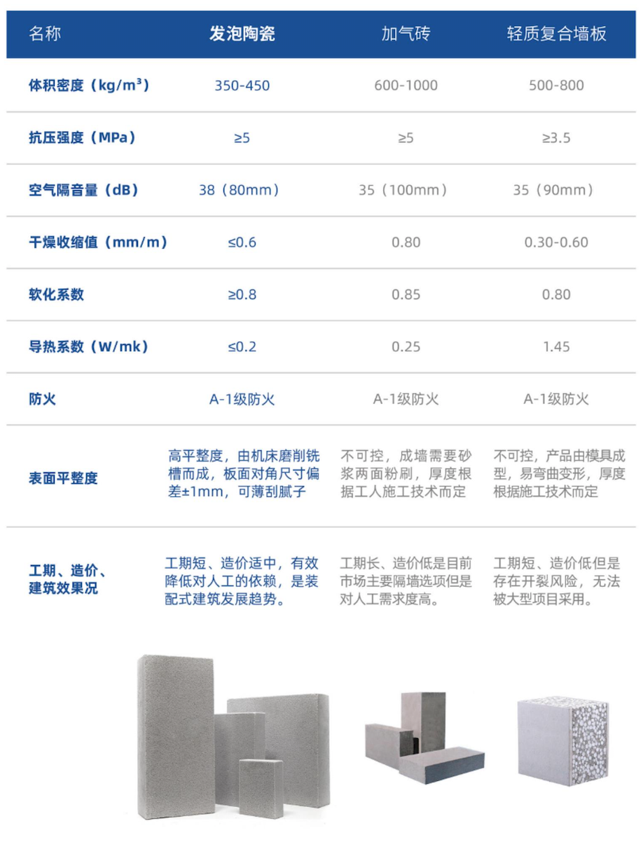 · 輕質(zhì):發(fā)泡陶瓷的容重為380~430kg/m?,只有傳統(tǒng)加氣磚的一半重量,可大大減少建筑結(jié)構(gòu)的荷載。