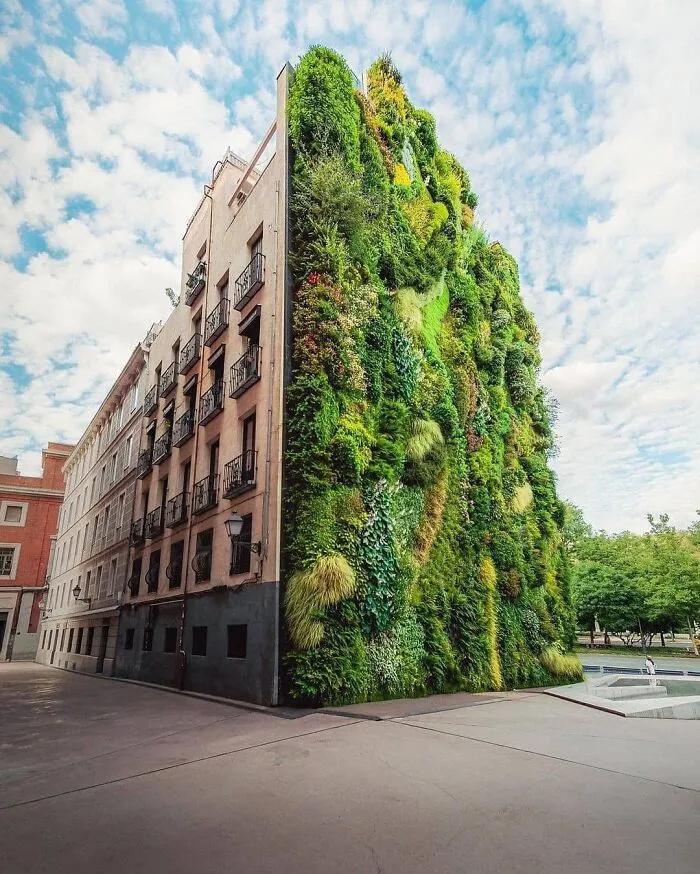 位于西班牙馬德里的垂直花園,位于馬德里當(dāng)代藝術(shù)博物館Caixa Forum之前,是目前世界上種植最好的垂直綠化景觀。它是帕特里克·布蘭克(Patrick Blanc )在2008年建造完成的。四層樓高的綠墻與相鄰建筑物的深橙色鐵銹形成鮮明的對(duì)比,植物茂盛的垂直花園吸引了游客坐在周圍休息,以躲避馬德里灼熱的太陽(yáng)。