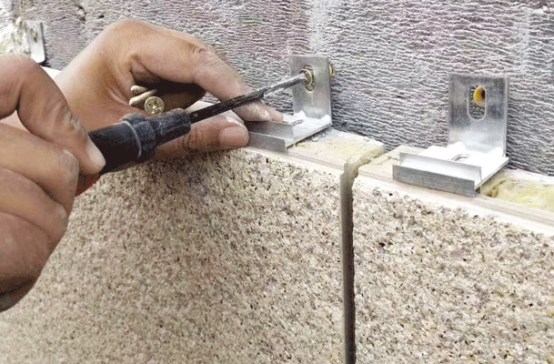 打孔埋置錨栓,固定錨固件。L型錨固件與H型掛件的連接件通過膨脹螺栓固定。