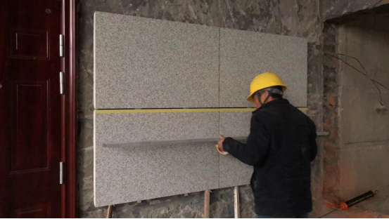 2. 根據(jù)設(shè)計要求,在保溫層粘貼基礎(chǔ)上,將陶瓷薄板保溫一體板立面鋪設(shè)到基層上,并用專用的膨脹螺栓將板材固定在基層上。