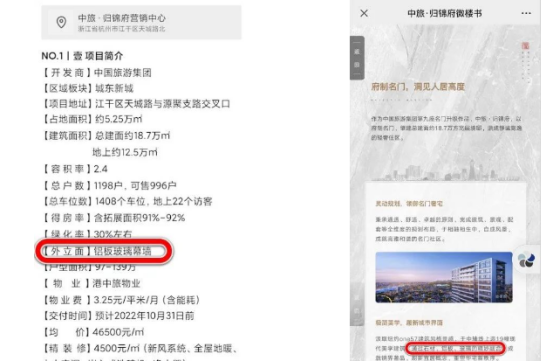 在此前該樓盤所有宣傳中,關(guān)于外飾面材質(zhì),對外口徑統(tǒng)一為鋁板+玻璃幕墻,從未出現(xiàn)涂料字眼。