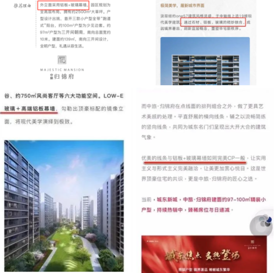 結(jié)合下面宣傳圖文,給購房者的感受是,樓盤外飾面不論哪個部位所用的材料都是鋁板+玻璃幕墻的組合,位置包括但不限于窗框周圍、腰線、山墻等。
